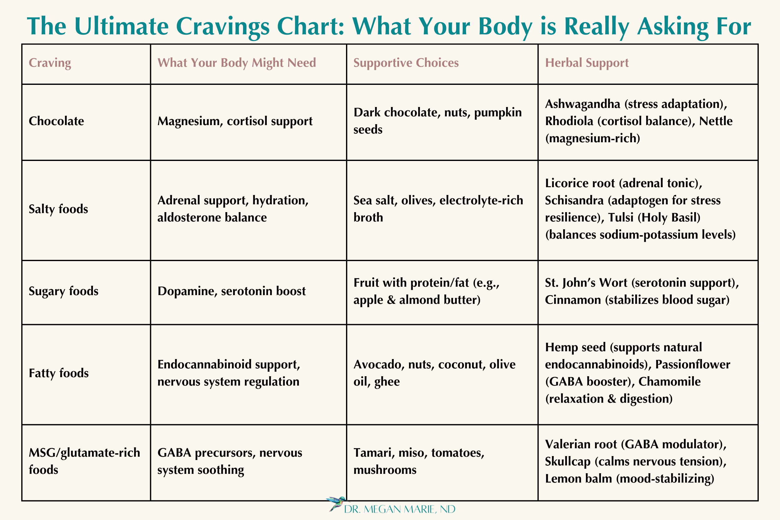 Cravings aren’t the enemy; they’re a signal from your body. Instead of silencing them with processed foods, use them as an opportunity to give your body what it actually needs—whether that’s more minerals, neurotransmitter support, nervous system regulation, or simply your own positive regard and attention.